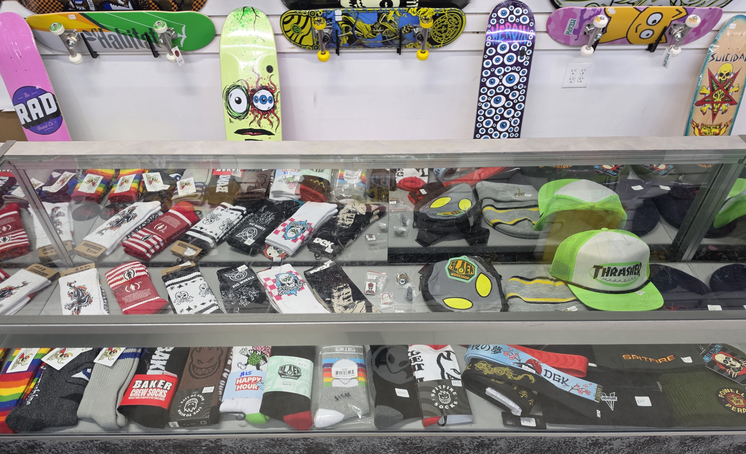 Skate Socks on the left, Pins belts and hip sac in the center, and Bennies on the right.