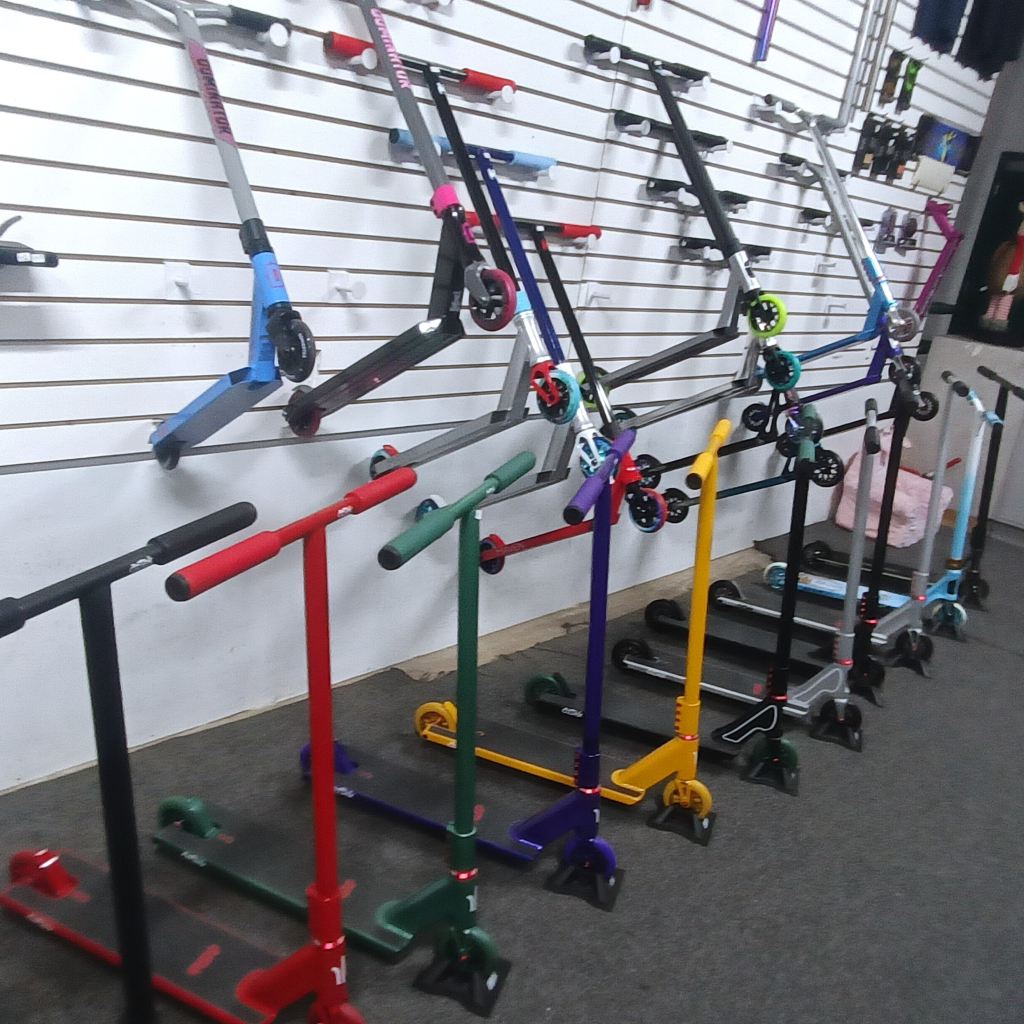 Yes, we have begun to stock scooter parts and complete! Decks, Wheels, Clamps, Bearings, Grips, Grip tape, and Forks are all in stock! Come in and check out our growing selection